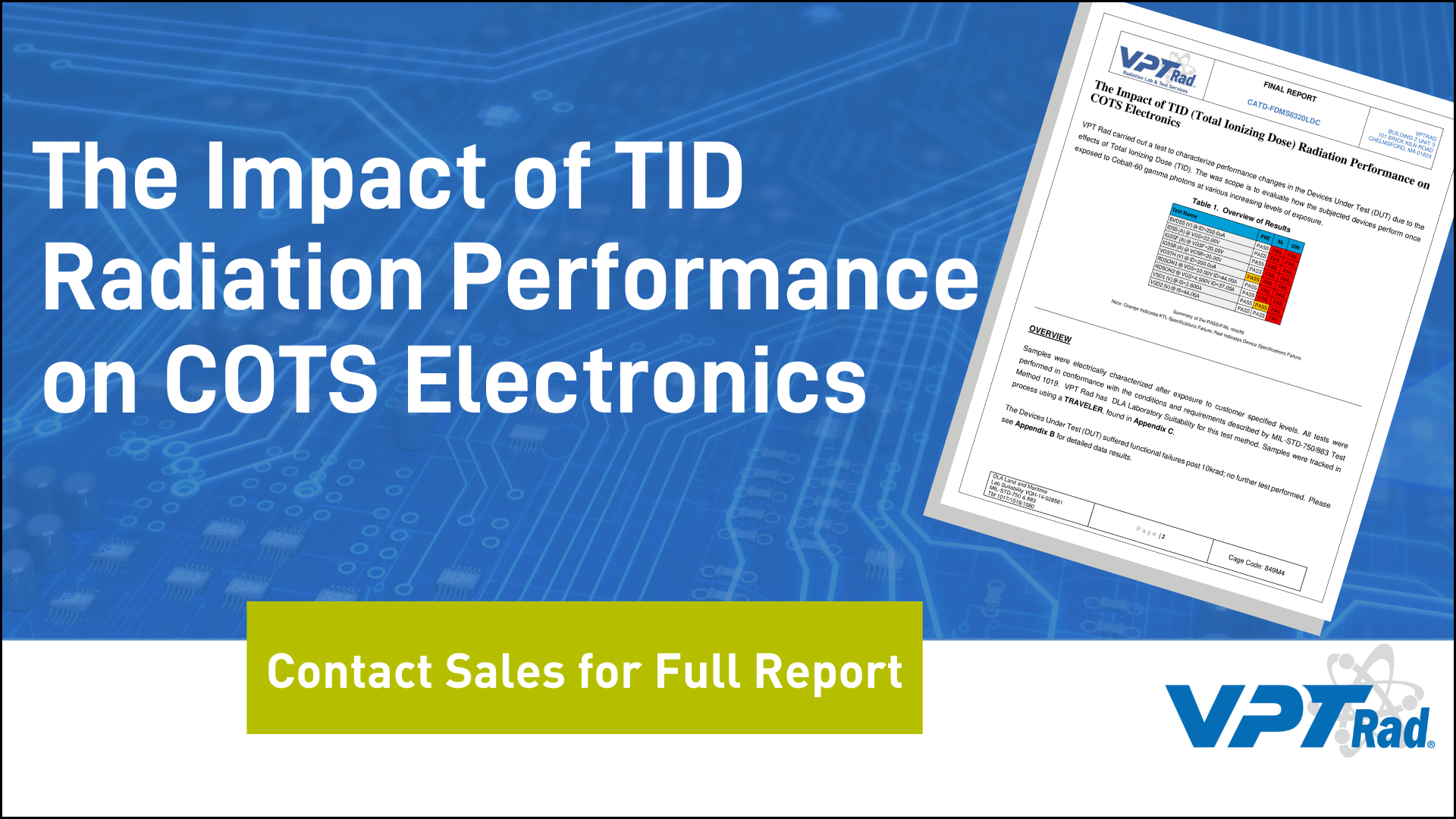 Samples were electrically characterized after exposure to specified levels. All tests were performed in conformance with the conditions and requirements described by MIL-STD-750/883 Test Method 1019. VPT Rad used it's DLA Laboratory Suitability for this test method. The Devices Under Test (DUT) suffered functional failures post 10krad; no further tests were performed. For complete test results, contact VPT Rad to learn more about the testing they perform on COTS electronics.