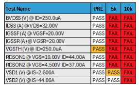 Note: Orange Indicates KTL Specifications Failure; Red Indicates Device Specifications Failure.