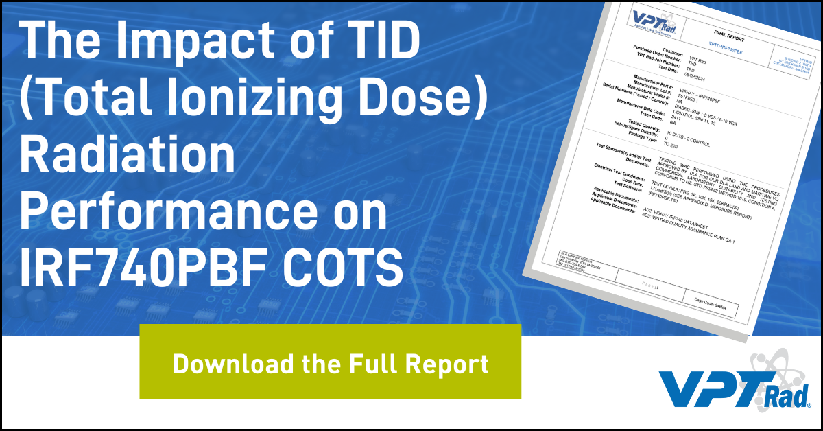 Samples were electrically characterized after exposure to customer specified levels. All tests were performed in conformance with the conditions and requirements described by MIL-STD-750/883 Test Method 1019. VPT Rad has DLA Laboratory Suitability for this test method. Samples were tracked in process using a TRAVELER, found in Appendix C. VGS Devices Under Test (DUT) began missing test specification limits at 10krad and suffered functional failures post 20krad. VDS DUTs passed all test specifications through 20krad. Please see Appendix B for detailed data results.